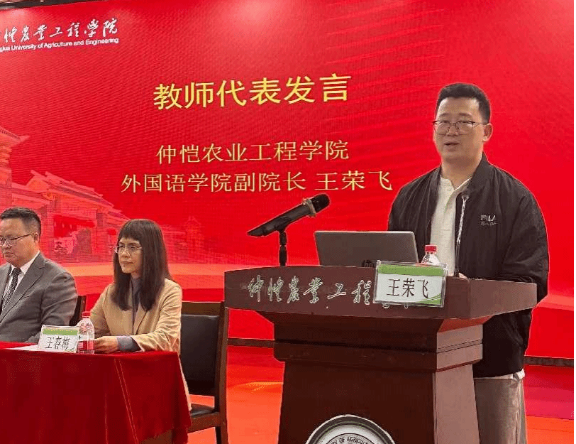 外国语学院王荣飞副院长作为教师代表进行发言。王老师表示,作为教师,深感责任重大,既要传授知识,也要引导学生健康成长,希望学生要勤奋学习,有针对性的学习,要求实创新,严于律己,正确处理好工作、生活、家庭和学习的关系。