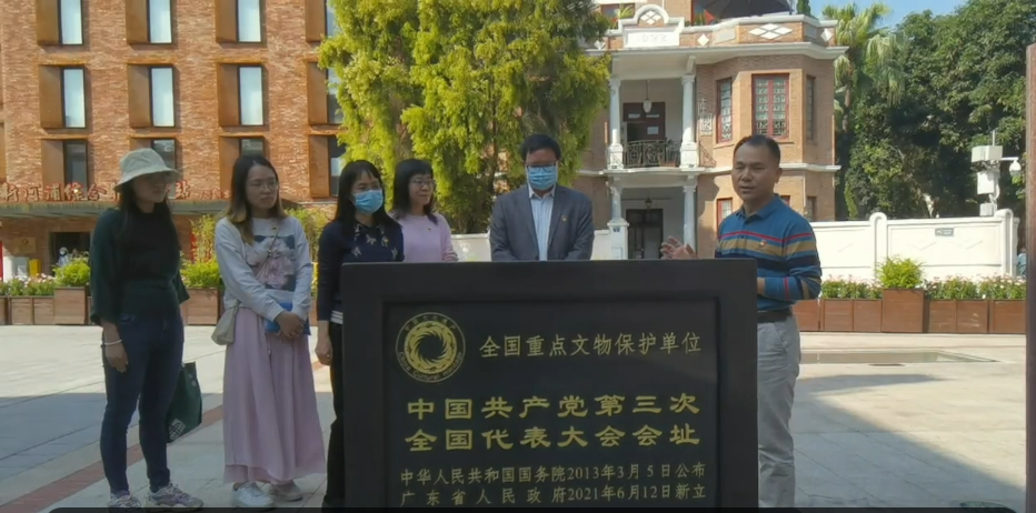 在纪念馆前,全体党员站在建馆纪念碑旁边,认真聆听党总支书记陈绍华讲述的中共三大会址的寻找建馆历程微党课。